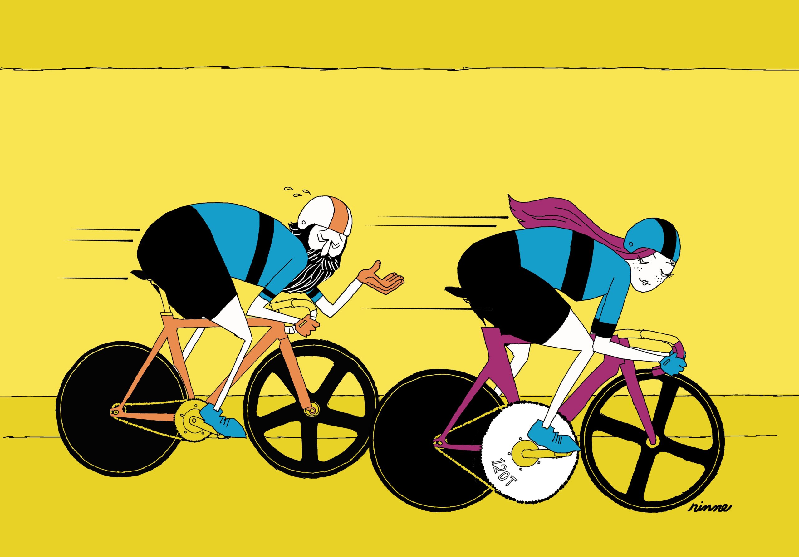 If you put a big gear in front and spin it fast enough, you can go faster. But it’s not that simple. You have to have the power to spin it, the power to turn it. What gear to use is one of the strategies of the rider. But if Sara had such a big gear, men would feel defeated.